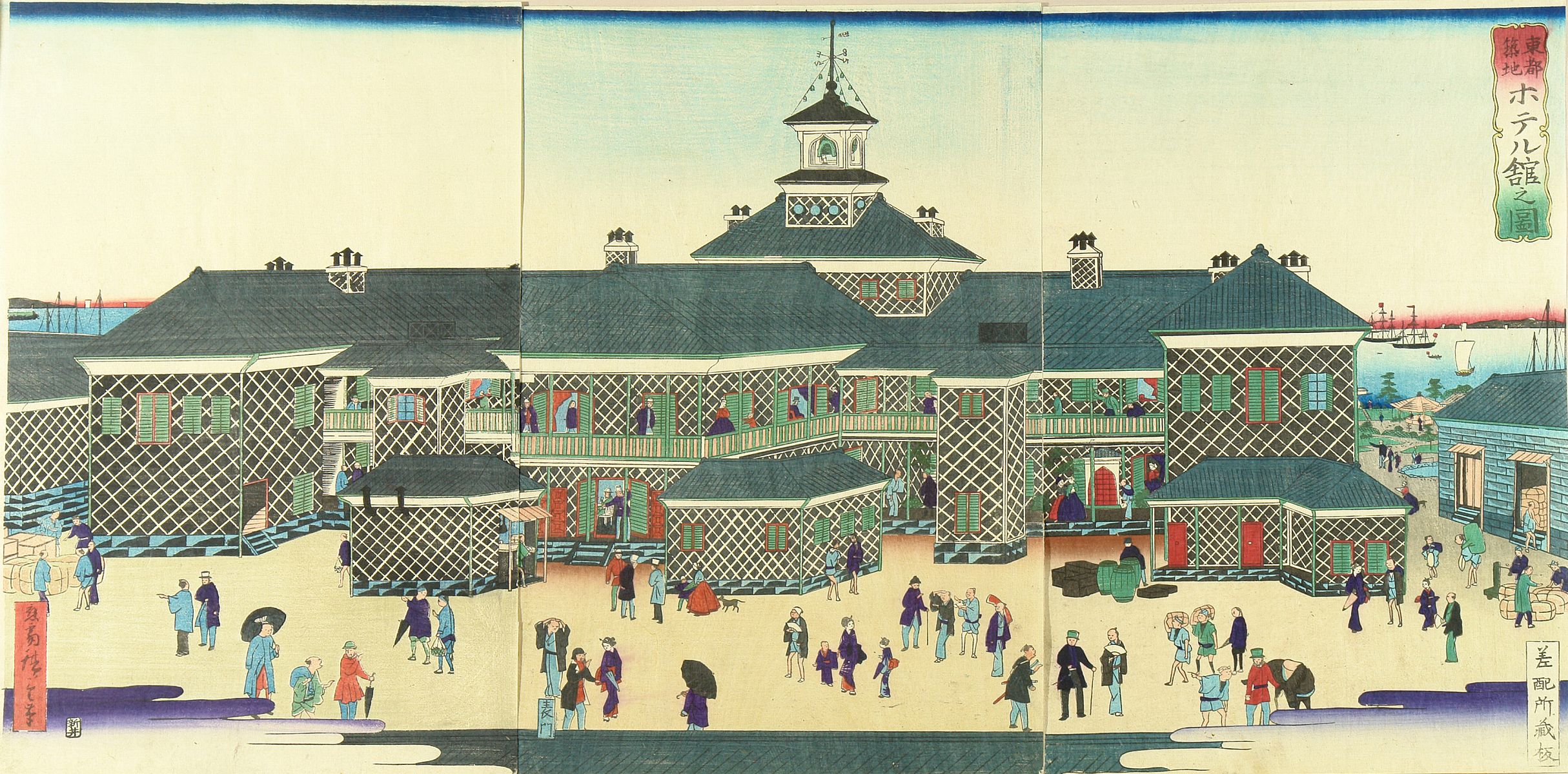HIROSHIGE III / Toto Tsukiji hoterukan no zu (View of the hotel at Tsukiji, the eastern capital), triptych