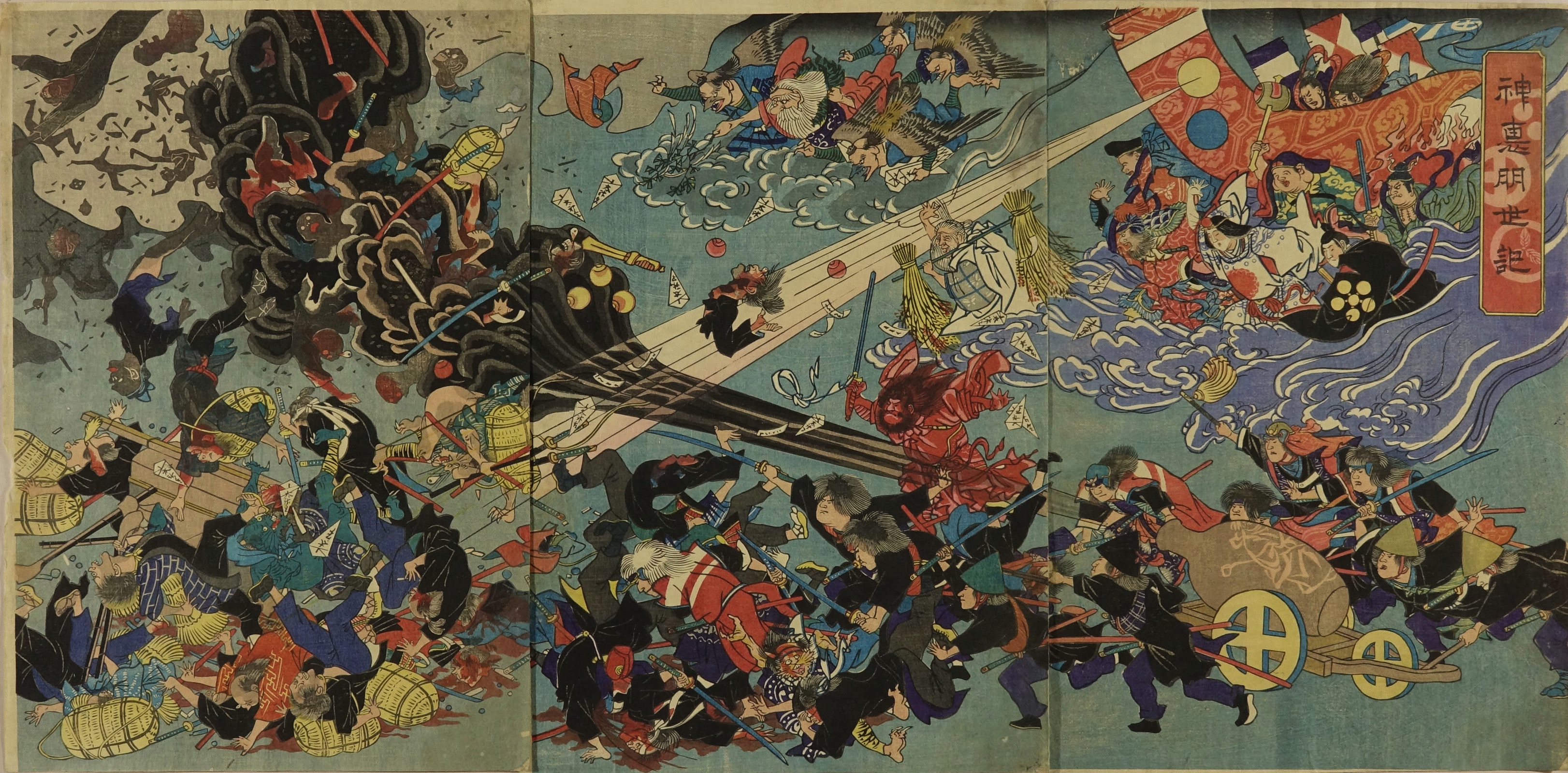 UNSIGNED / Scene of Boshin War, Gods helping Shimazu Clan, triptych