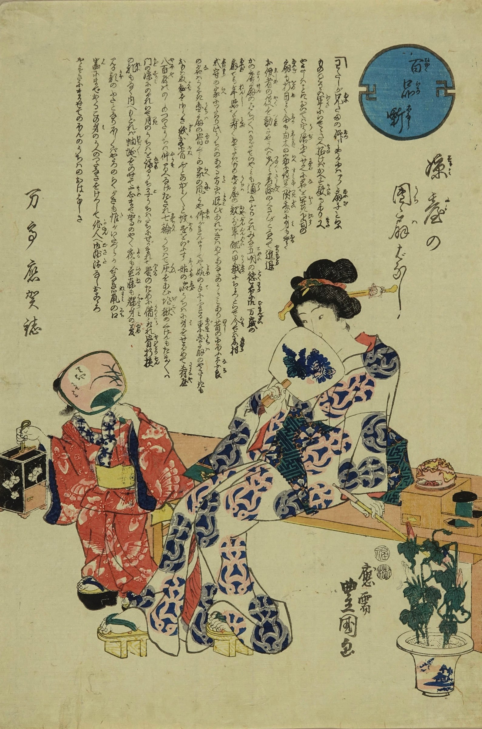 TOYOKUNI III / Ryodai no uchiwa banashi (Story of round fan on the bench), from Hyakushina banashi (One-hundred stories)