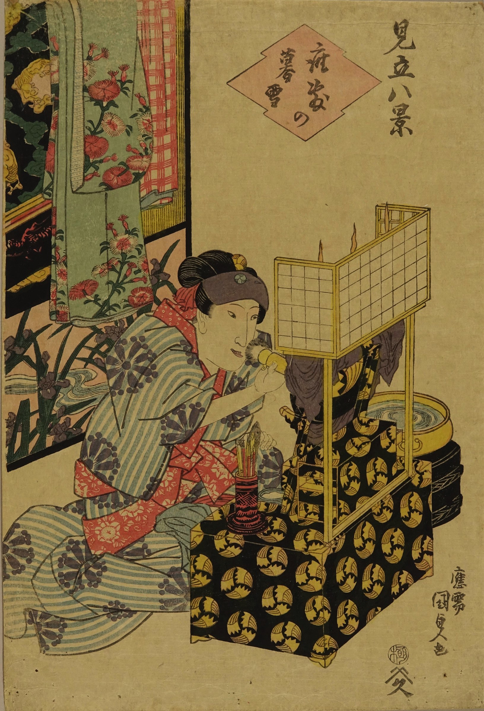 Portrait of an actor making up, subtitled Zashiki no bosetsu (Evening snow in an interior), from Mitate hakkei (Eight parodies)