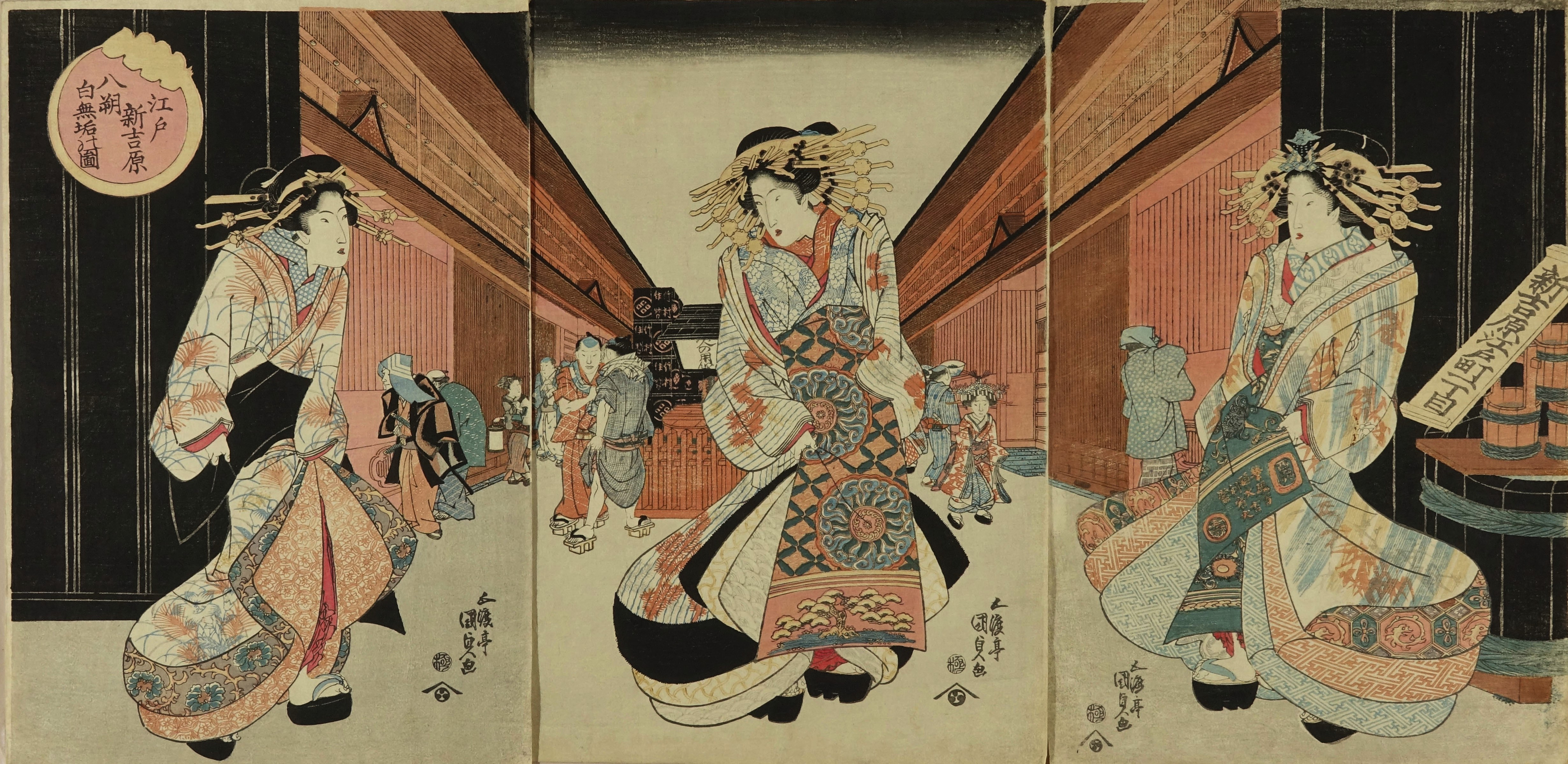 Edo Shin-Yoshiwara hassaku shiromuku no zu (Courtesans wearing white robe at the first day of eighth month at Shin-Yoshiwara pleasure quarters), triptych