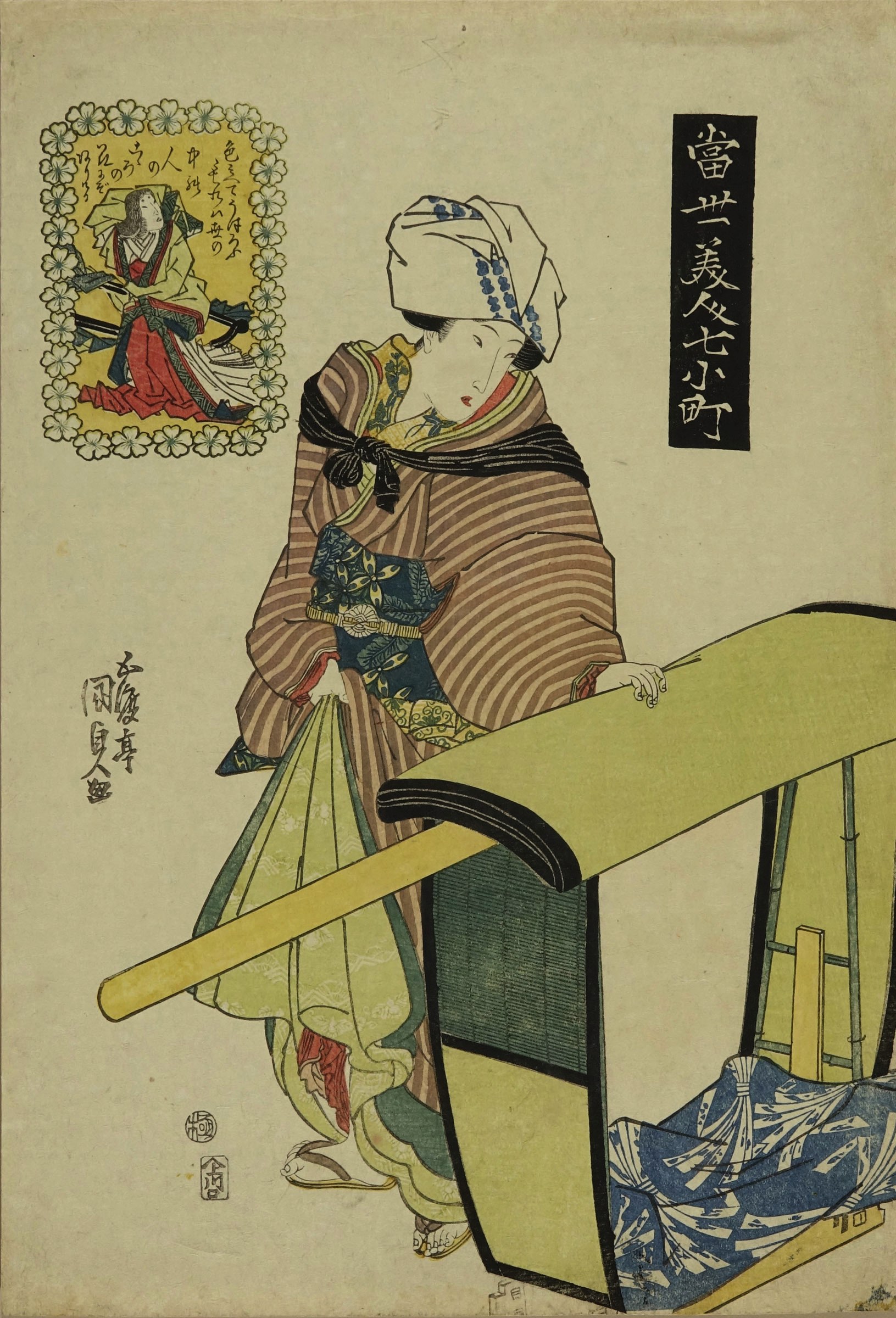 KUNISADA / Standing beauty by a palanquin, from Tosei nana komachi (Modern seven episodes of Ono no Komachi)