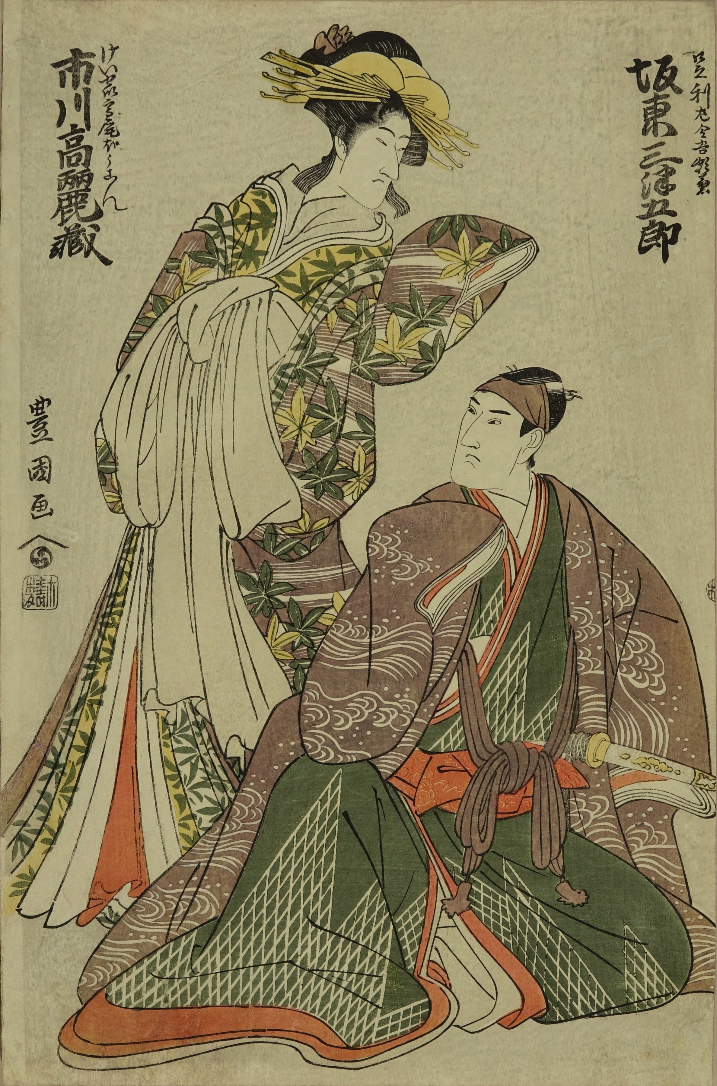 Portrait of actor Bando Mitsugoro in the role of Ashikaga Yorikane and Ichikawa Komazo in the role of the ghost of courtesan Takao
