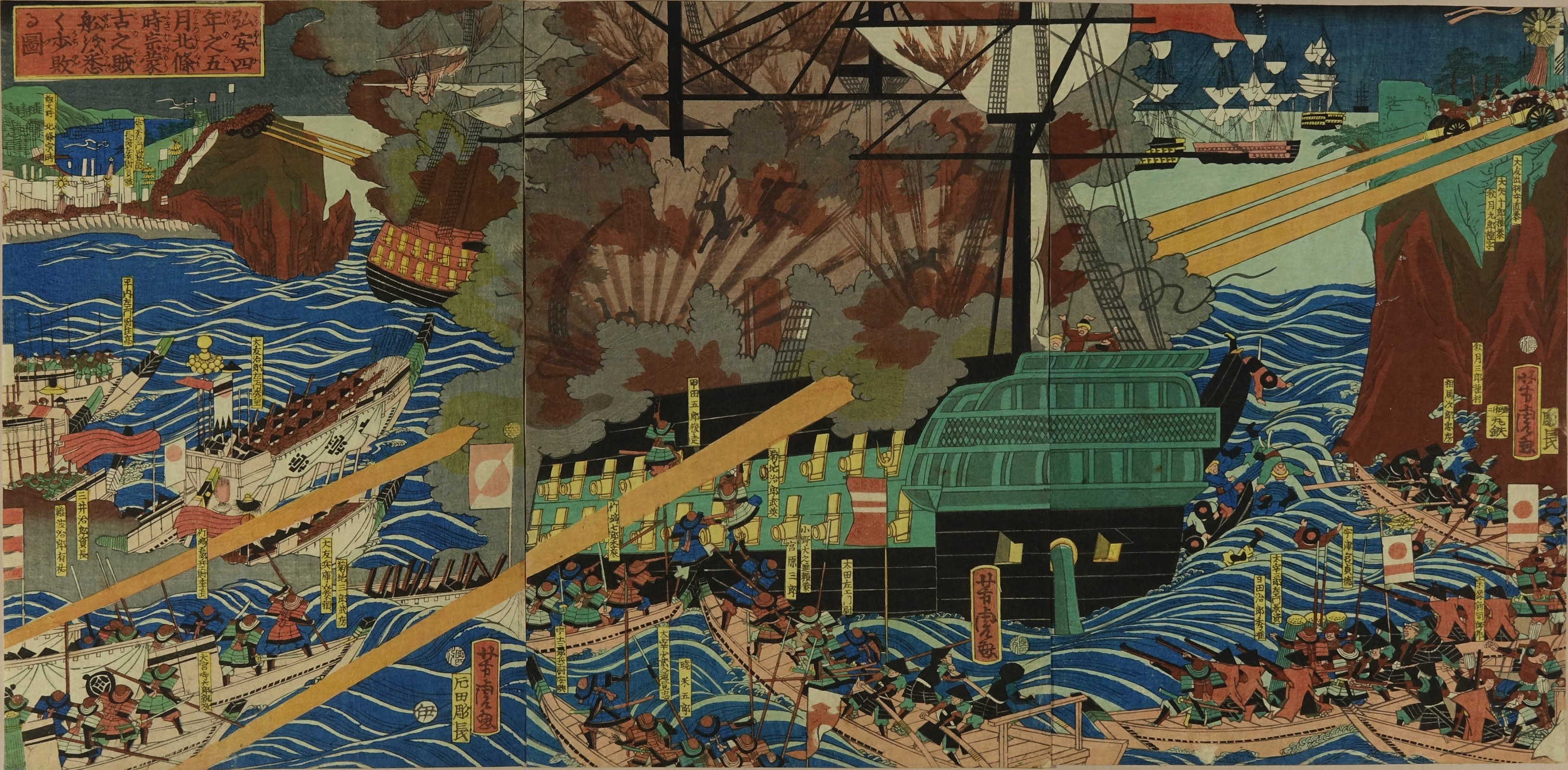 YOSHITORA / Parody of the battle of Shimonoseki or British invasion, illustrated as Mongolian invasion, triptych