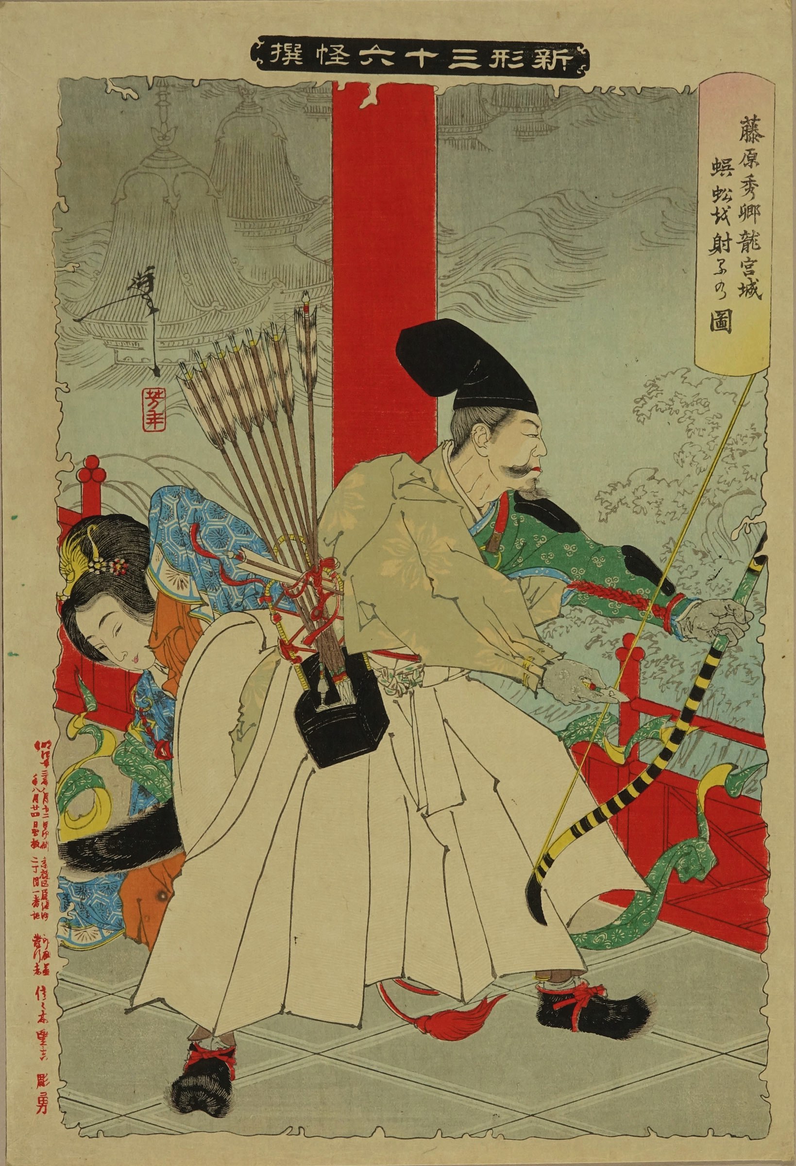 Fujiwara no Hidesato shooting the centipede at the Dragon King's palace, from Shinkei sanjurokkaisen (The new forms of the thirty-six ghosts)