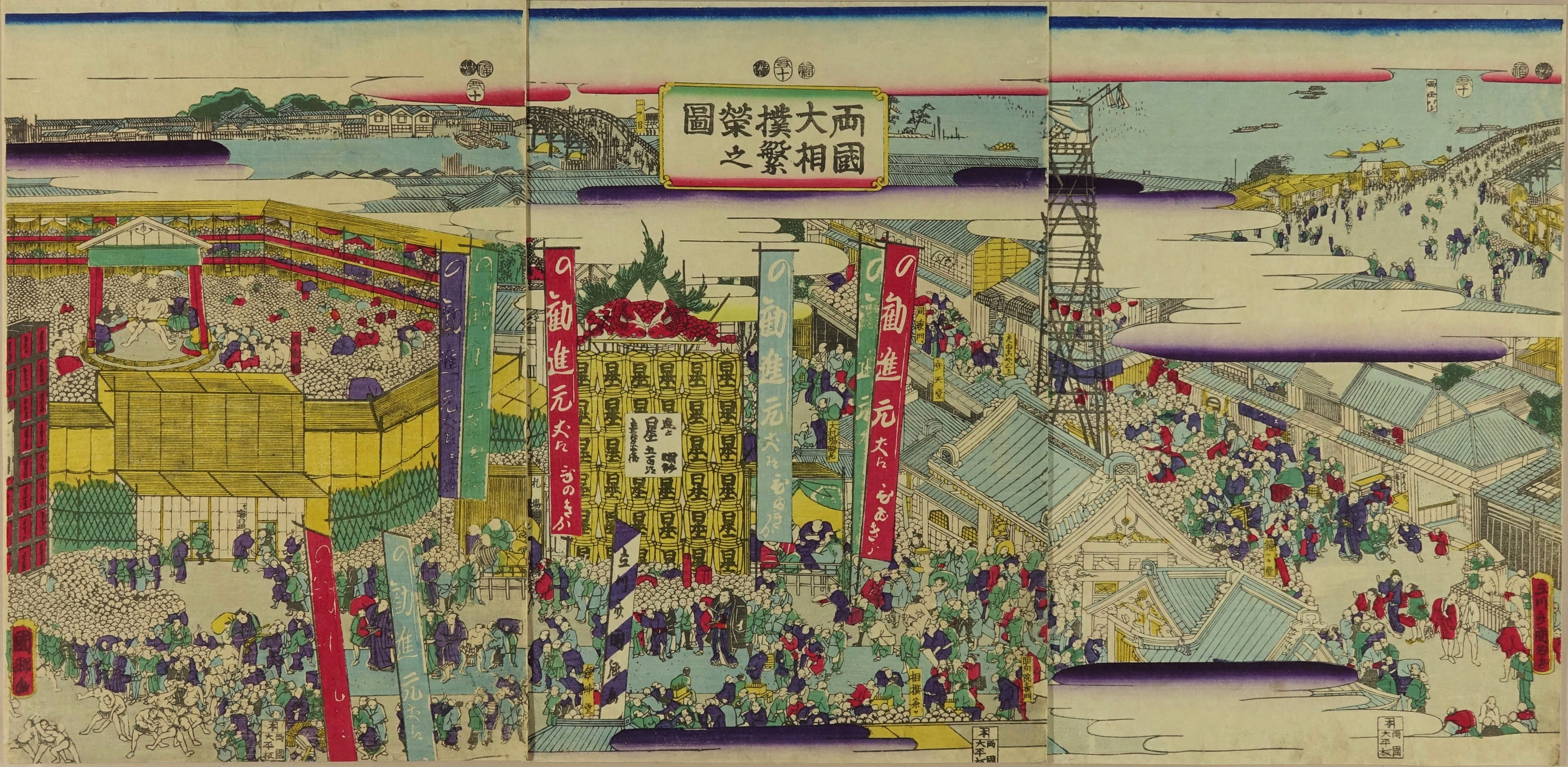 KUNITSUNA / View of dedicatory sumo match at Ryogoku, triptych