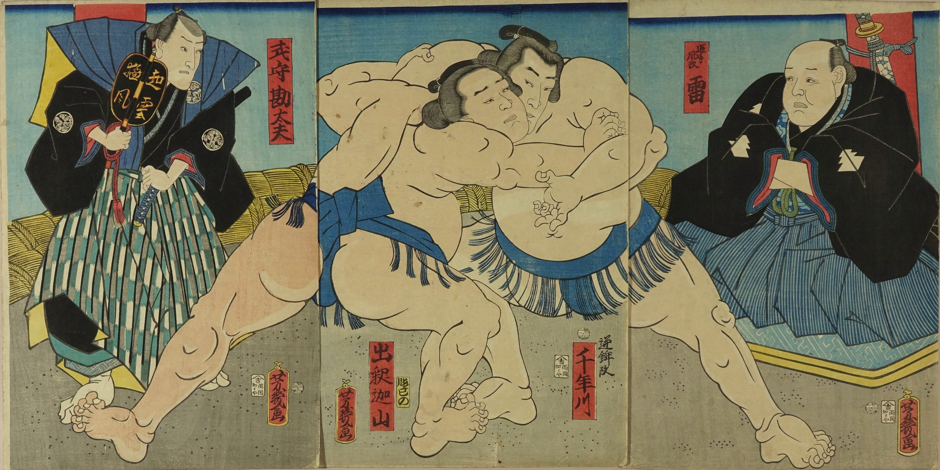 YOSHIIKU / Sumo match between Sennenkawa and Deshakayama, triptych