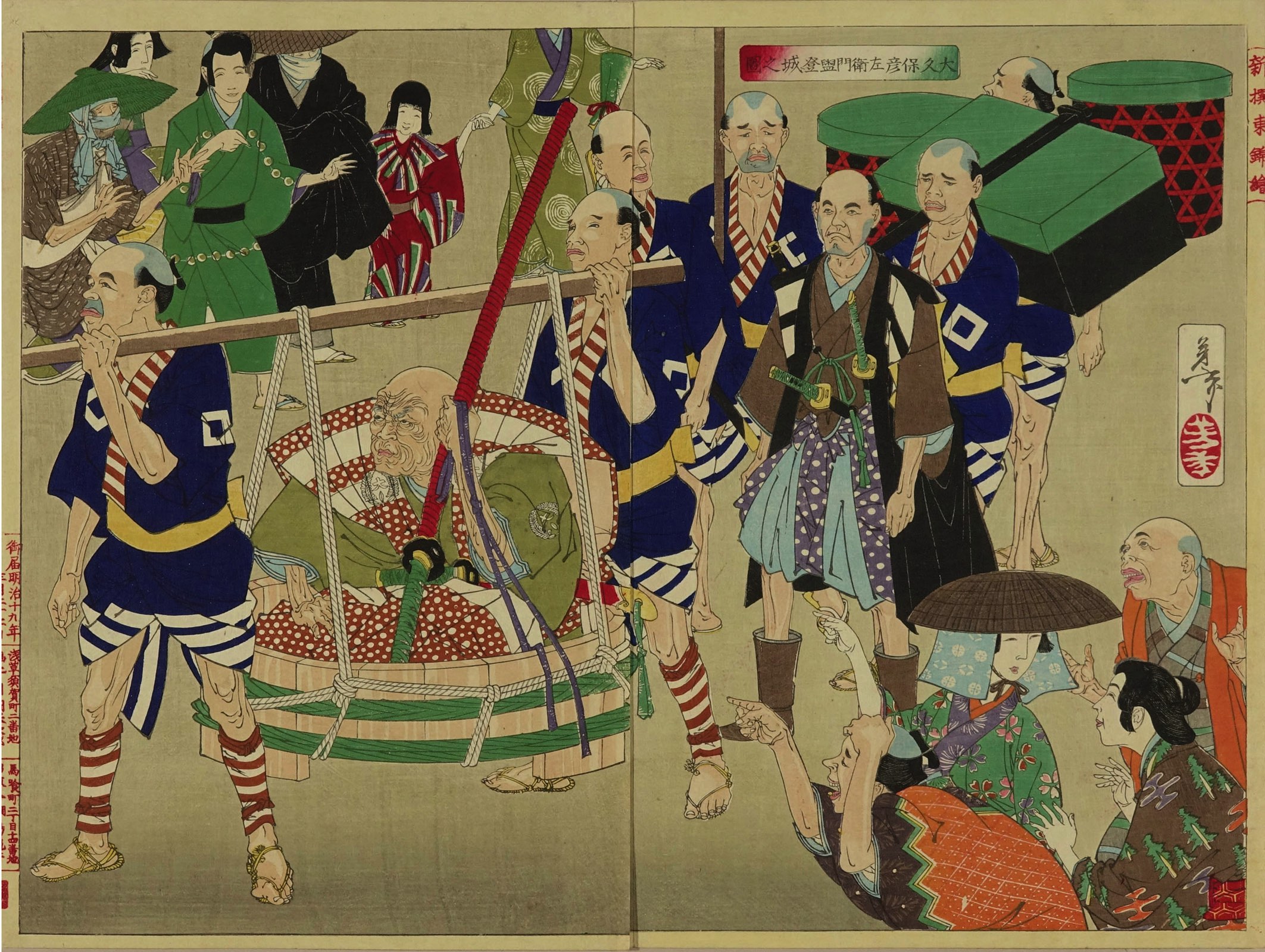 Okubo Hikozaemon tarai tojo no zu (Okubo Hikozaemon visiting the castle by a washtub), from Shinsen azuma nishiki-e (New selections of eastern brocade pictures), diptych
