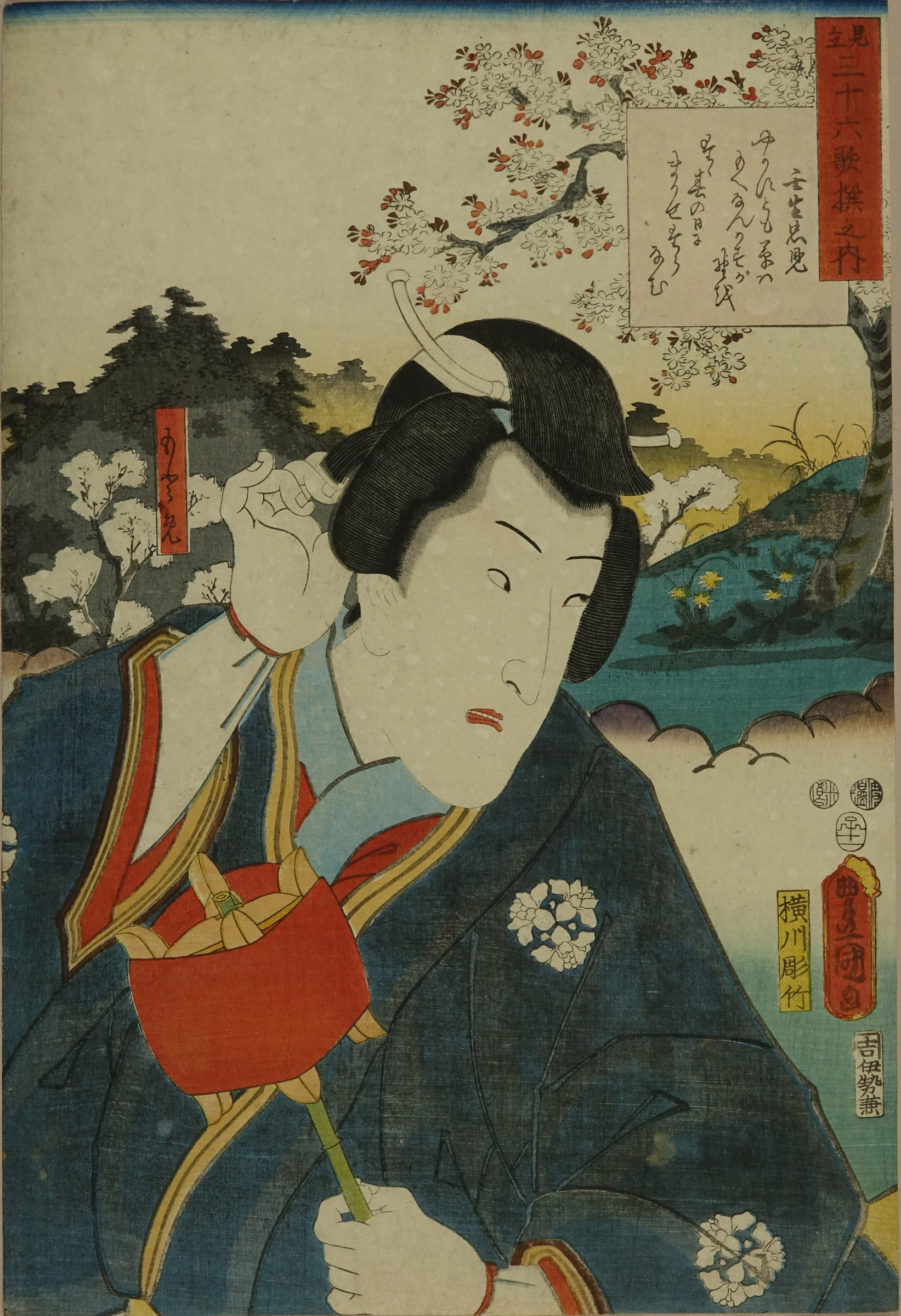Portrait of an actor in the role of Motome, with a poem by Mobu no Tadami, from Mitate sanjurokkasen no uchi (Parody of the thirty-six poets)