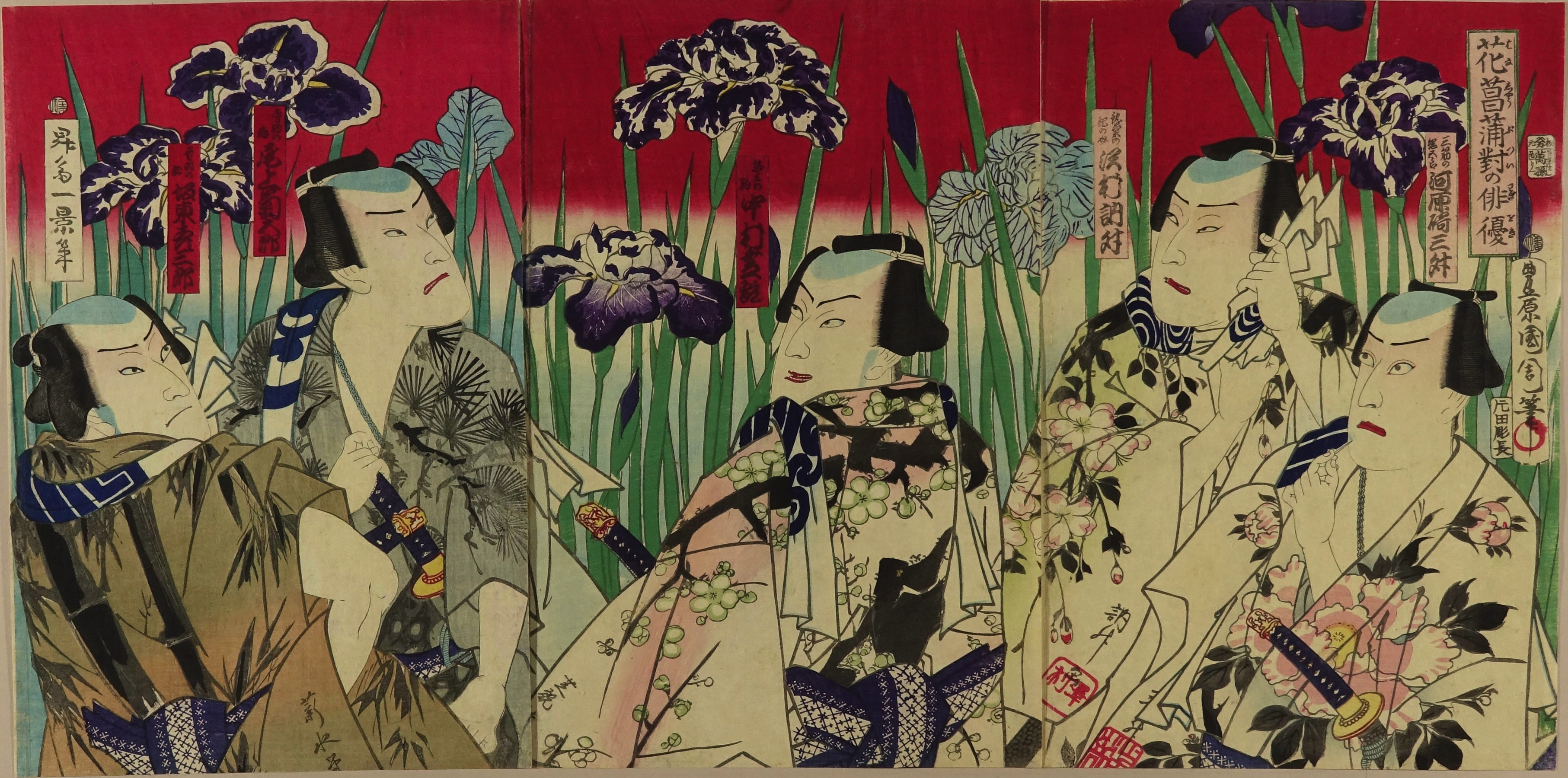 KUNICHIKA / IKKEI / Portrait of celebrated actors before background of iris, triptych