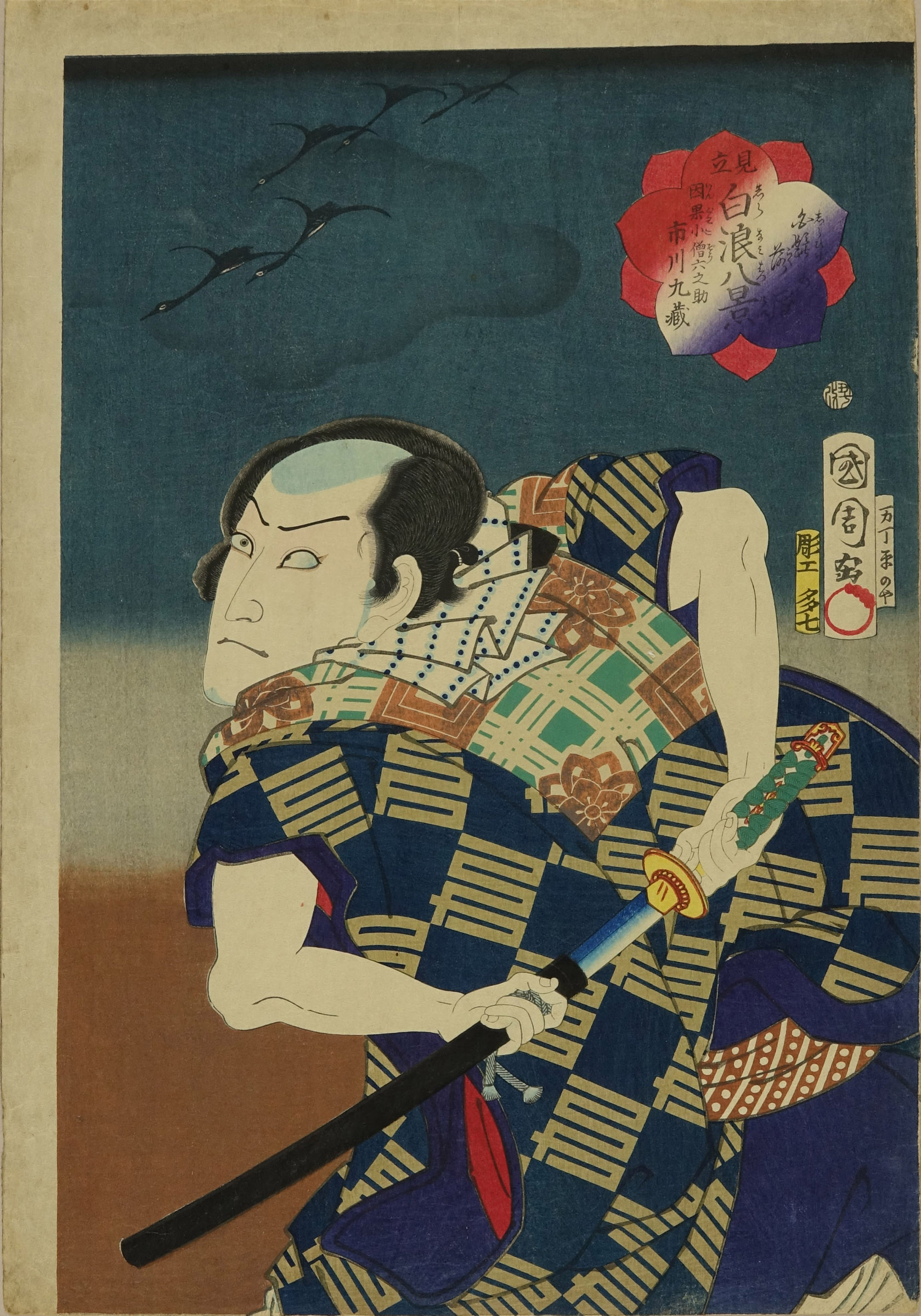Portrait of the actor Ichikawa Kyuzo in the role of Ingakozo Rokunosuke, subtitled Shirahige no rakugan (Descending geese at Shirahige), from Mitate shiranami hakkei (Parody of eight bandit performances of kabuki)