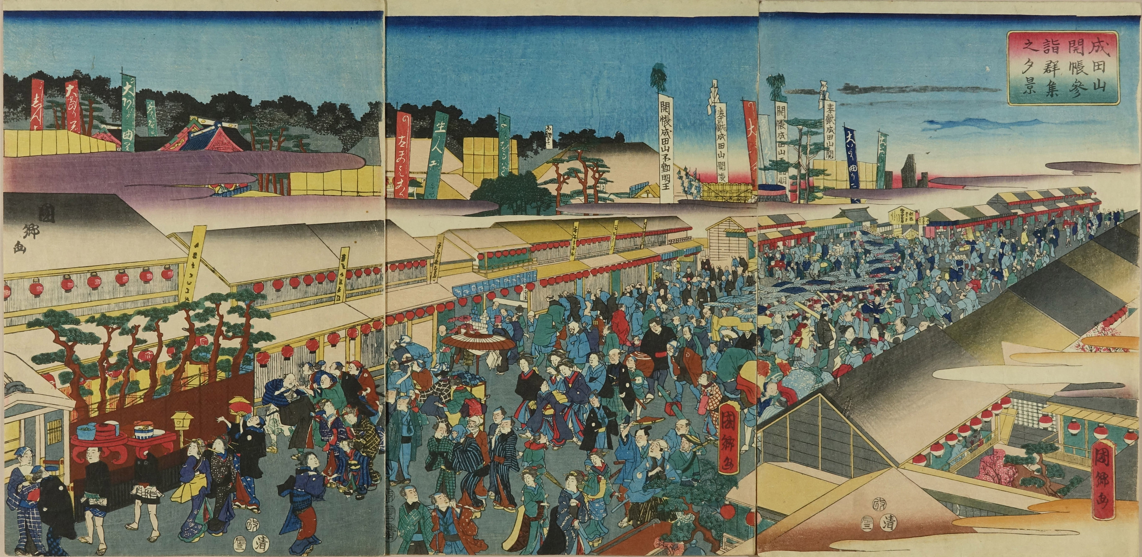 YOSHIHARU / Evening view of crowd visiting public exhibition of sacred object at Narita Shrine, triptych