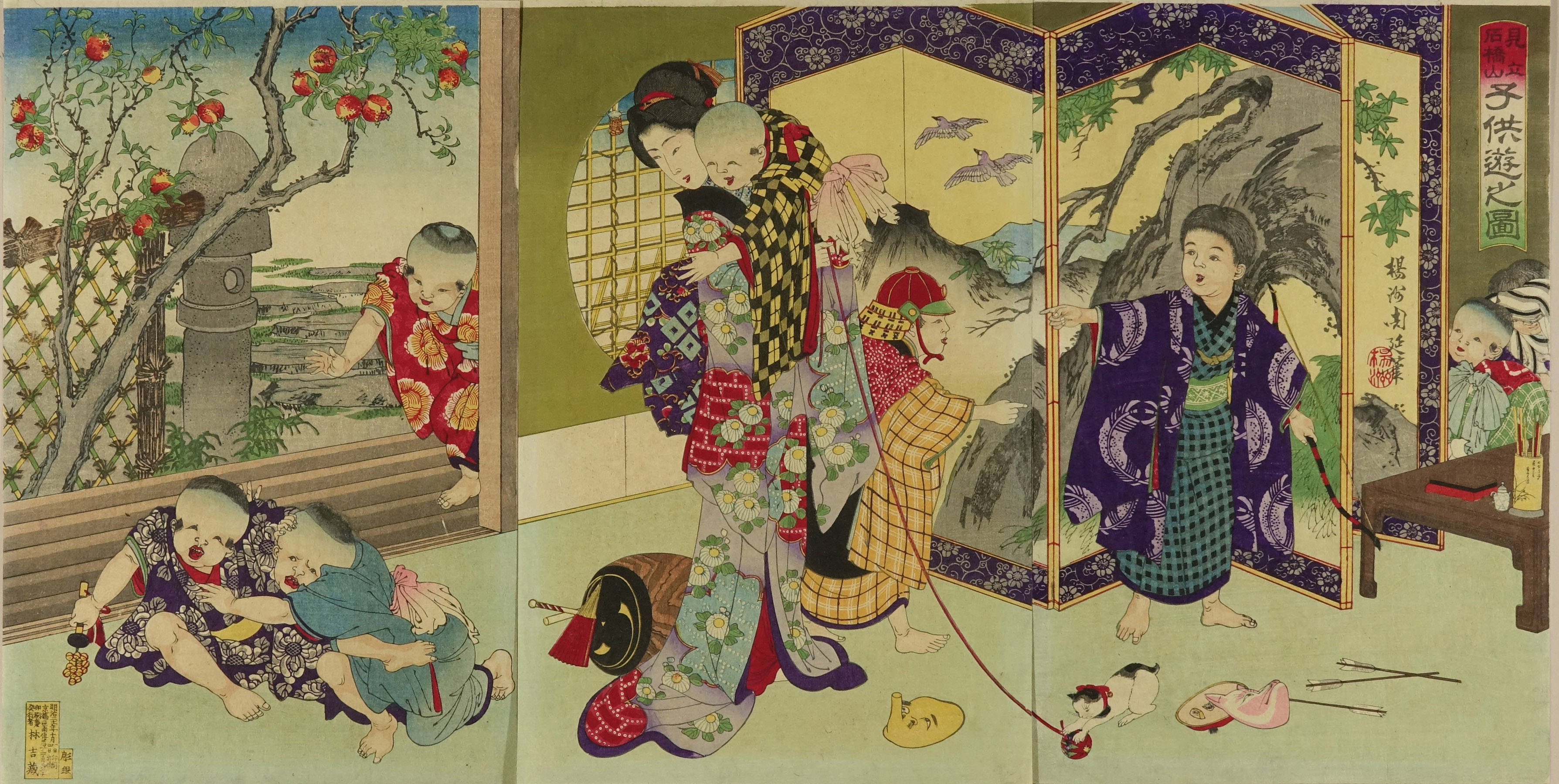 Playing children, a parody of the battle of Ishibashiyama, triptych