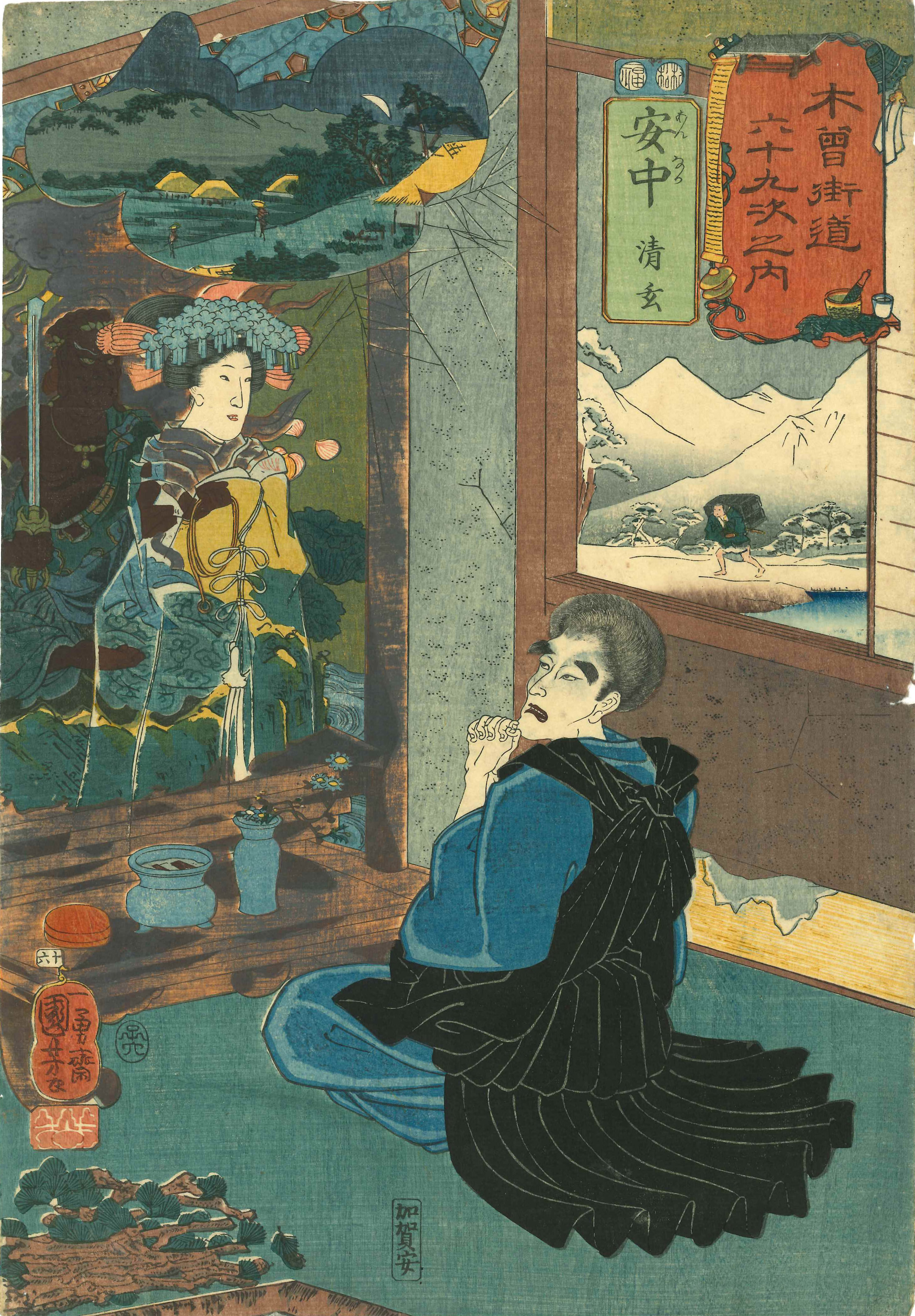 Annaka, with picture of priest Seigen, from Kisokaido rokujukyu tsugi no uchi (the Sixty-nine stations of the Kisokaido)