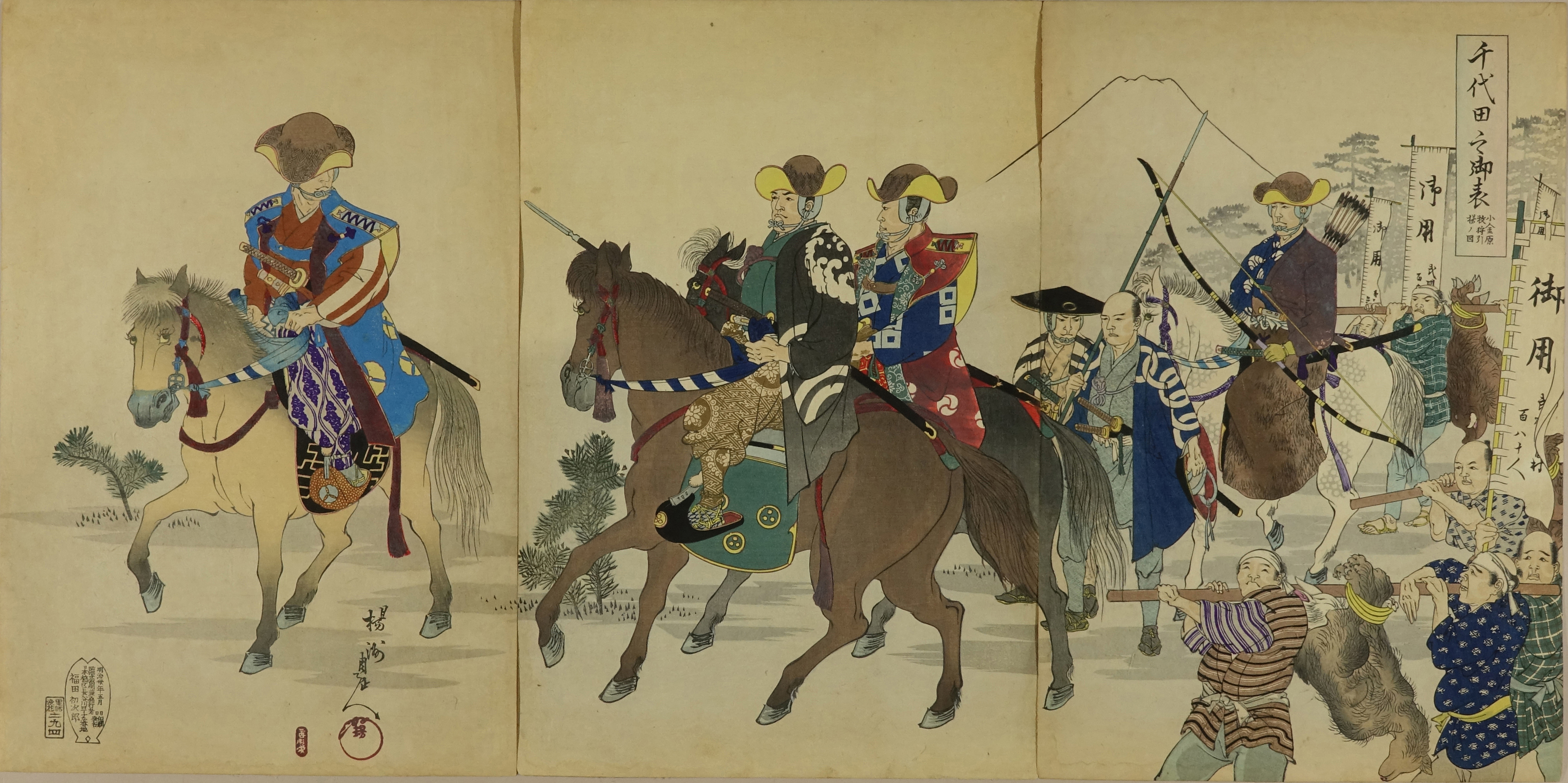 Koganehara makigari hikiage no zu (Leaving hunting ground at Koganehara), from Chiyoda no on'omote (Outer palace of Edo Castle), triptych