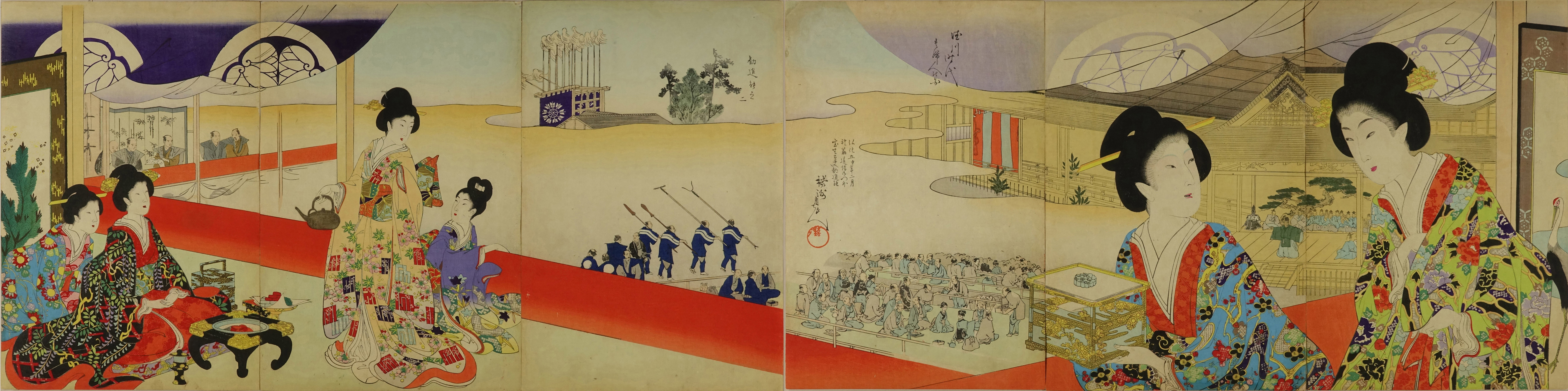 Beauties watching dedicatory Noh performance for Hosho School masters, from Tokugawa jidai kifujin no zu (Noble ladies of Tokugawa era), hexaptych