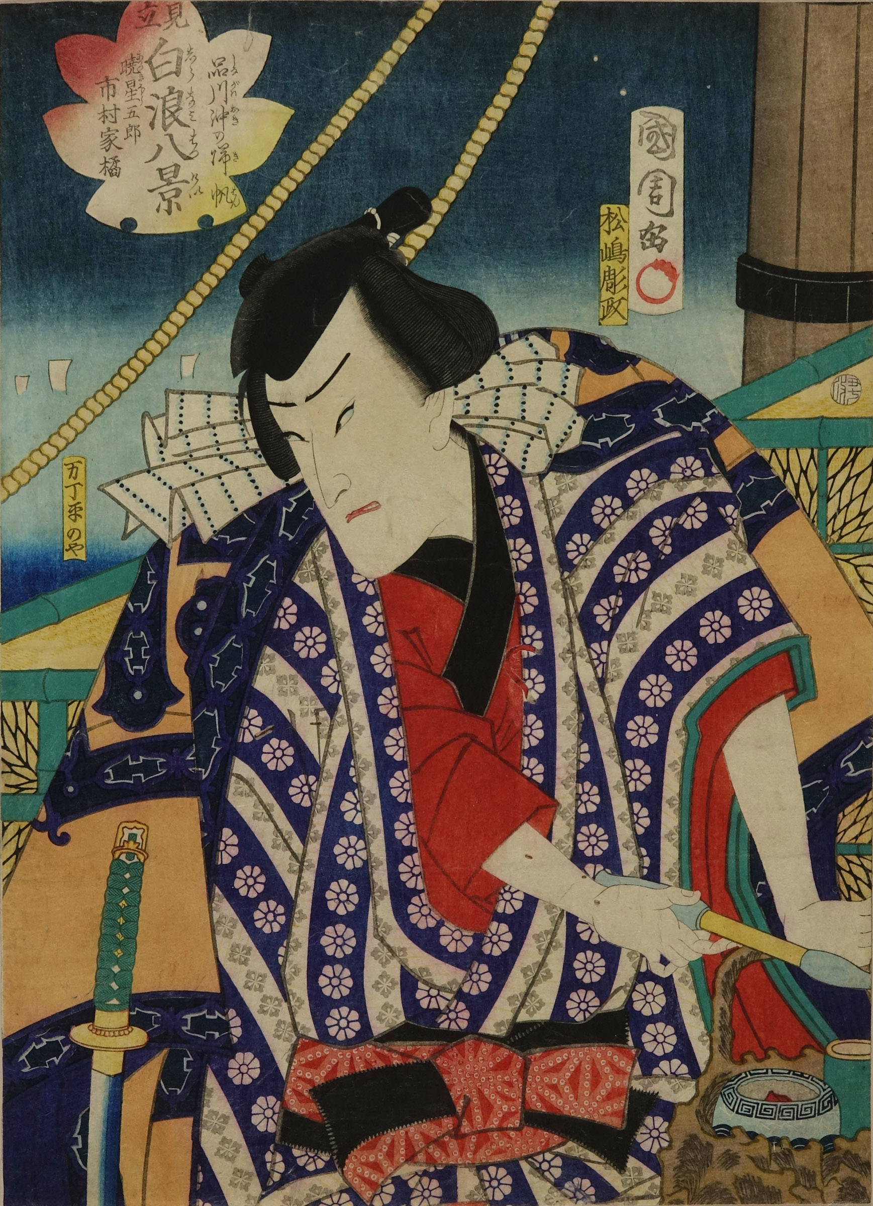 A portrait of the actor Ichikawa Kakitsu as Akatsukiboshi Goro, subtitled Shinagawa oki no kihan (Returning sail to Shinagawa), from Mitate Shiranami hakkei (Eight views of bandit)