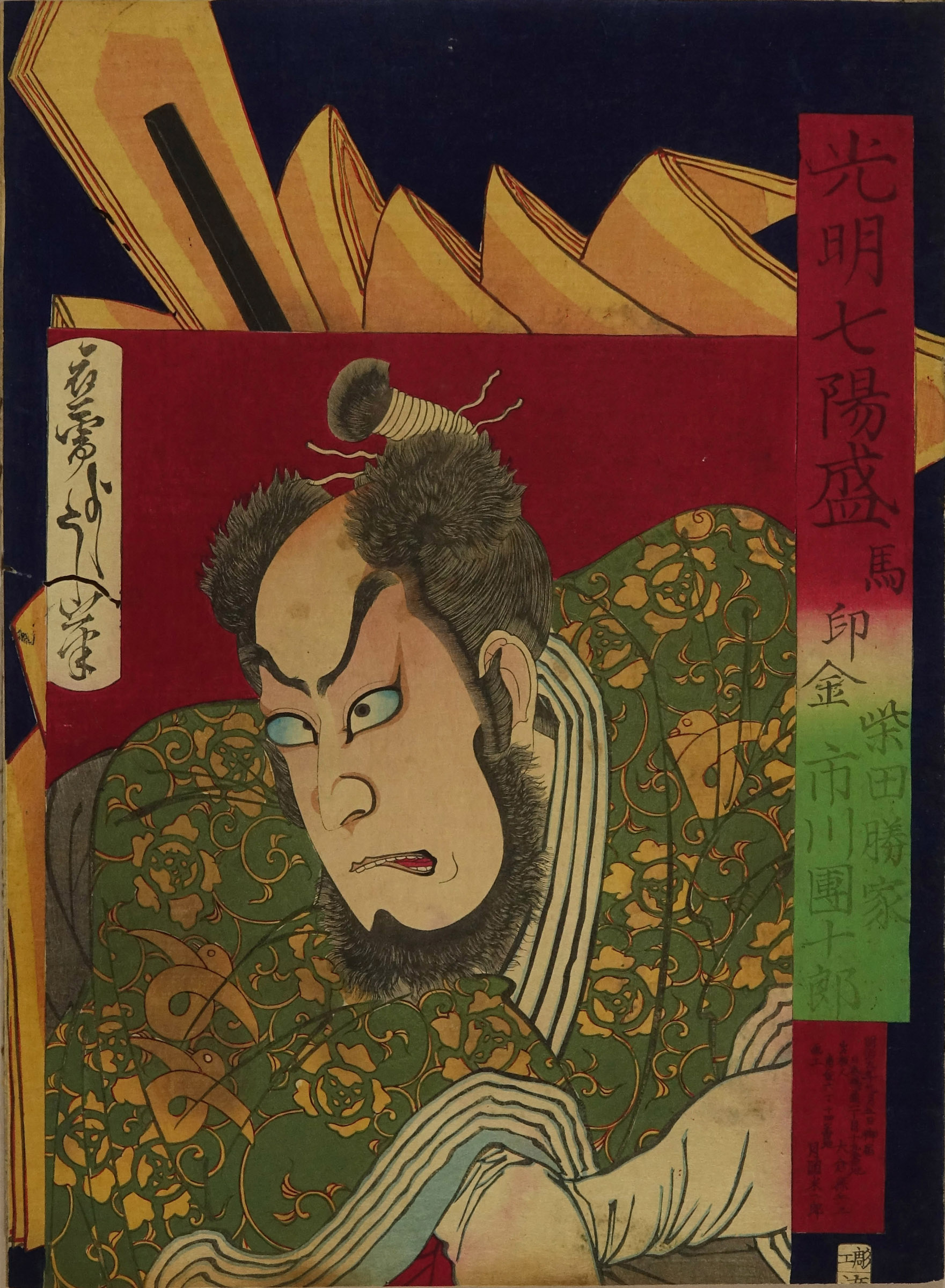 Portrait of the actor Ichikawa Danjuro in the role of Sibata Katsuike, titled Umajirushi kin (Gold of horse banner), from Komyo shich yosei (Seven briliant stars)