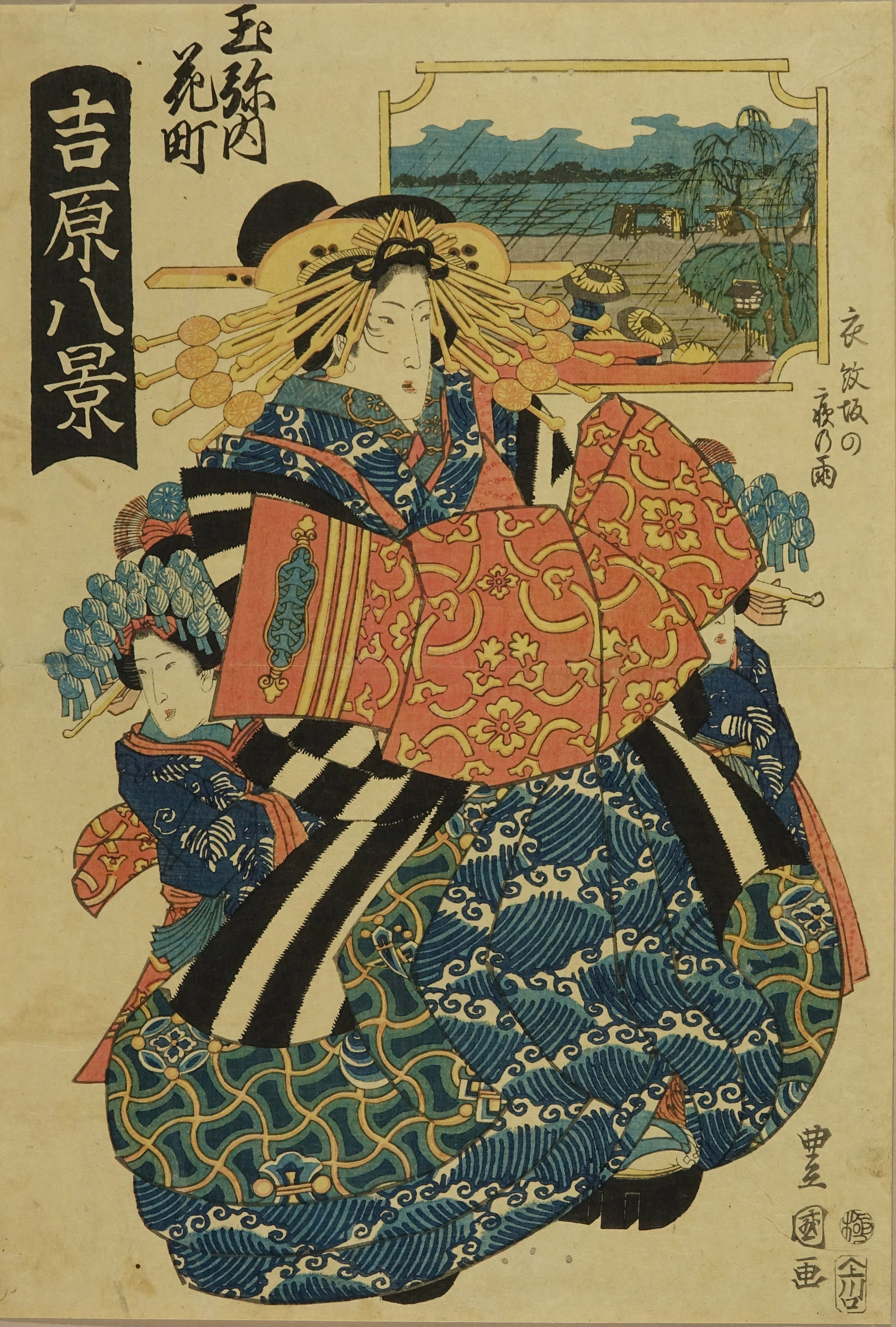 Emonzaka no yoru no ame (NIght rain at Emon Hill), from Yoshiwara hakkei (Eight views of Yoshiwara), with portrait of the courtesan Hanamachi of Tamaya