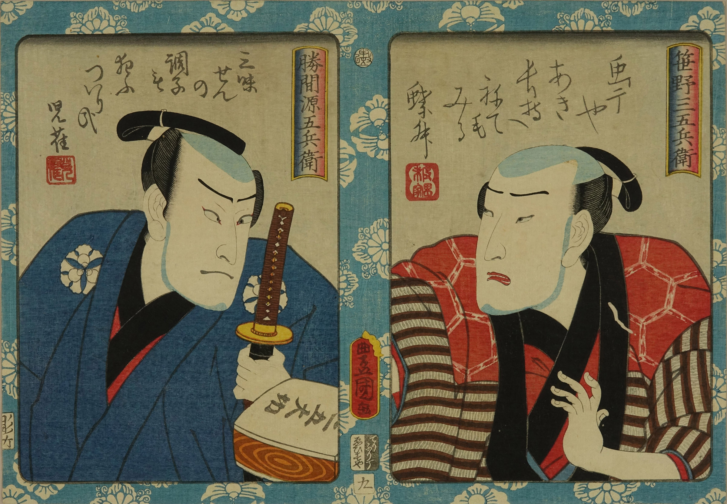 Portrait of actor Ichikawa Ichizoo III in the role of Sasano Sangohei, and Nakamura FukusueI in the role of Katsuma Genbobei