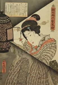 TOYOKUNI III / Beauty reading a book under light of lantern, titled